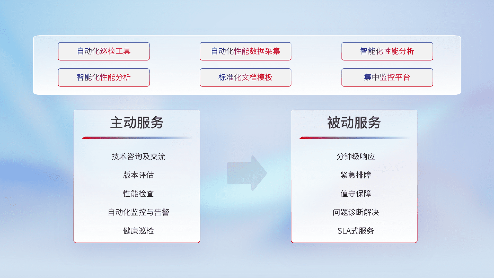 智能化工具和标准化文档,,,,保障服务质量,,提供主动服务(包含技术咨询、、、、版本评估、、、、性能检查、、、自动化监控与告警、、、健康巡检)和被动服务包含(分钟级响应、、、、紧急排障、、、值守保障、、、问题诊断解决、、、SLA服务)。。